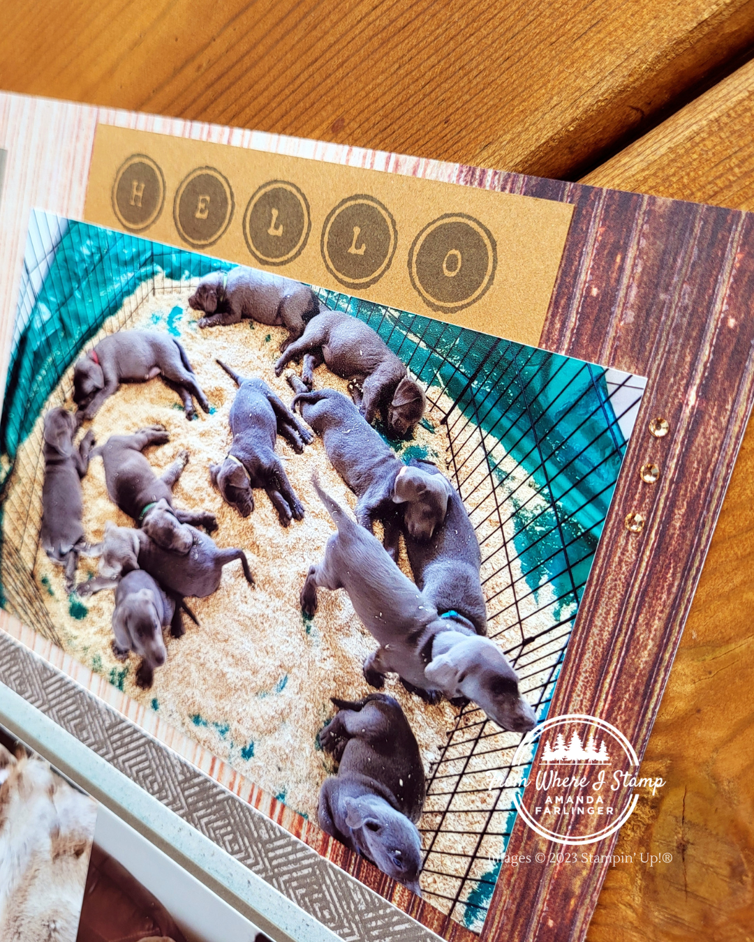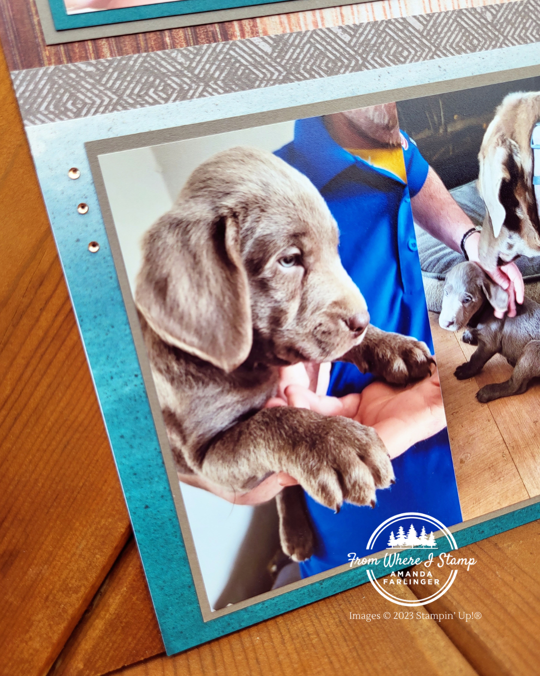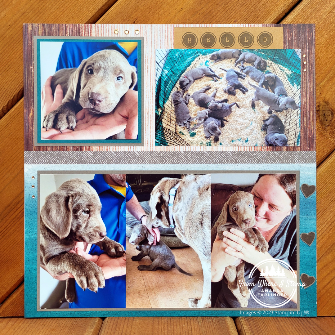 The colour of the mat for the puppies and Flynn’s fur colour match so well with the Earthen Elegance 12″ x 12″ Designer Series Paper. In my video I show how I decided to extend the use of the designer series paper by cutting the 12″ x 12″ sheets roughly in half then gluing them onto a Basic White 12″ x 12″ cardstock. The metal sheeting design looks really neat and I want to use it on another layout about Flynn. There are SO many photos of him!
