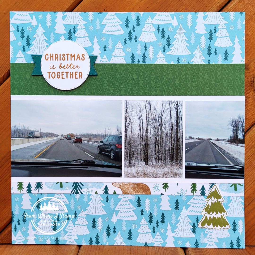 The colours used are my favourites listed on the package of the A Walk in the Forest designer series paper. The four colours I chose were Pretty Peacock, Old Olive, Pecan Pie and Cherry Cobbler. Pecan Pie ink was used to stamp the title “Christmas is better together”. Want to view the supply list for this scrapbook layout? Keep scrolling to find the button or click here to view the list now.